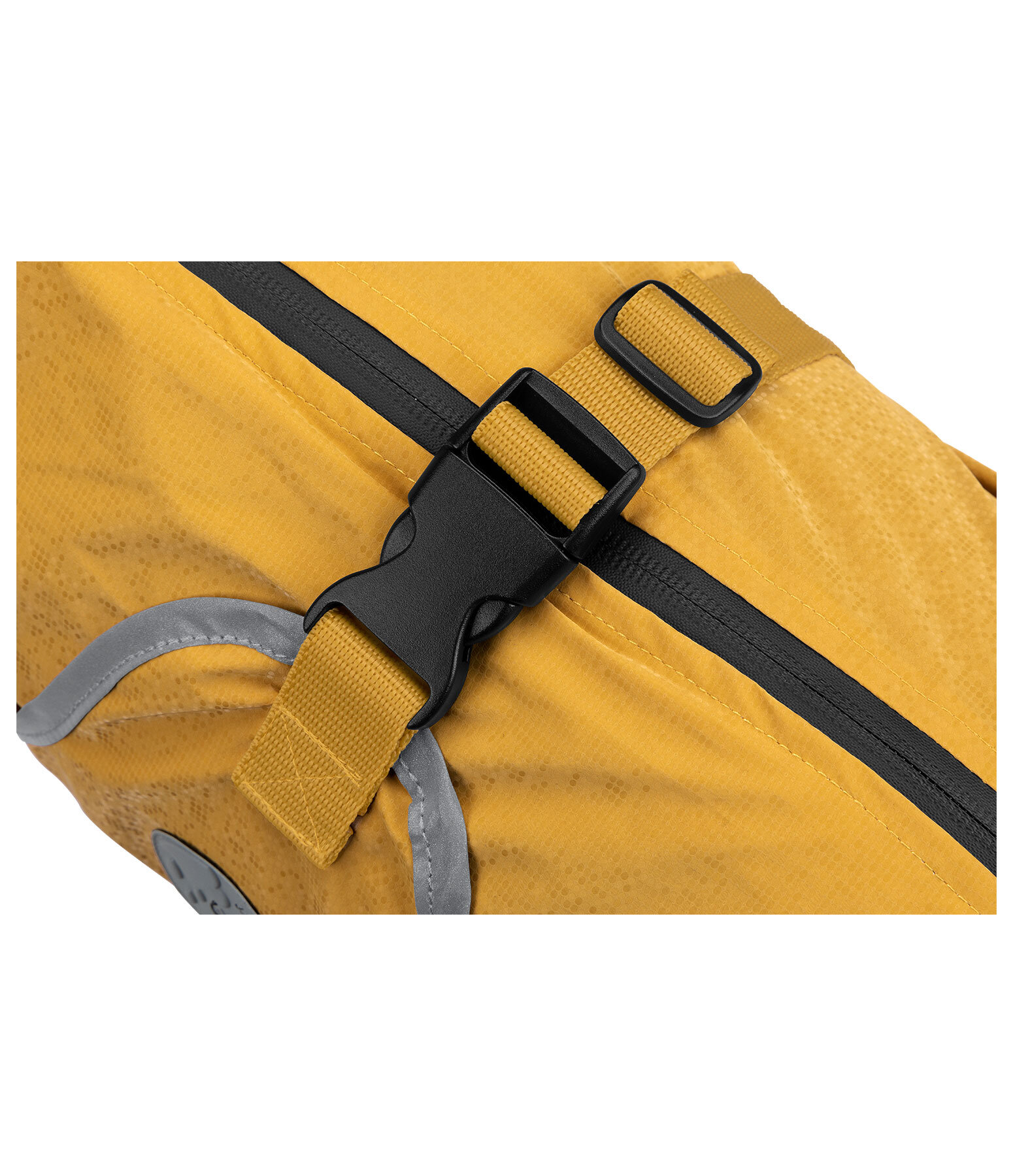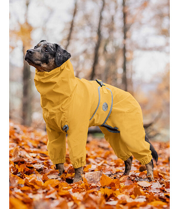 Betrouwbare bescherming tegen regen voor honden met getapete naden en waterdichte ritssluiting langs de ruglijn. Dankzij de extra lange, elastische hoge hals met opening voor de kraag, de beenbedekking met elastische tailleband en de extra lange buikflap is de jas ideaal voor langharige honden met veel vacht op hun buik en benen. Het bespaart je het droogwrijven van je hond na een wandeling. De reflecterende band en logobadge bieden extra veiligheid in het donker. Om de jas aan te trekken, open je eerst de rits en de buikflap volledig. Trek vervolgens de hoge hals over het hoofd van de hond en laat de hond met alle vier de poten door de daarvoor bestemde beenstukken klimmen. Tot slot kun je de rits aan de achterkant en de clipsluiting van de buikflap daarboven sluiten. De buikband is net als de hoge hals, individueel verstelbaar en kan worden aangepast aan je hond om te voorkomen dat de vacht uitglijdt en de regen binnendringt. 100% polyester.