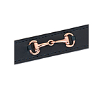 Deze sierlijke hoogwaardige leren riem is versierd met kleine bitjes over de hele lengte. Verkrijgbaar in zwart of bruin leer met een zilveren gesp en in marine-blauw leer met rosé-gouden gesp. Breedte 2,5 cm.