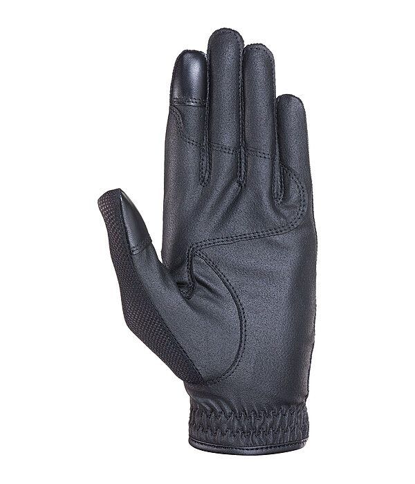 Chique, ademende zomerhandschoen van luchtig mesh-materiaal op de achterhand voor warme zomerdagen. Versierd met fonkelende strasssteentjes. Manchet met klittenbandsluiting. Met versteviging op de wijsvinger. Geschikt voor touchscreen. Bovenkant en palm gemaakt van 100% nylon. Mesh 100% polyester.