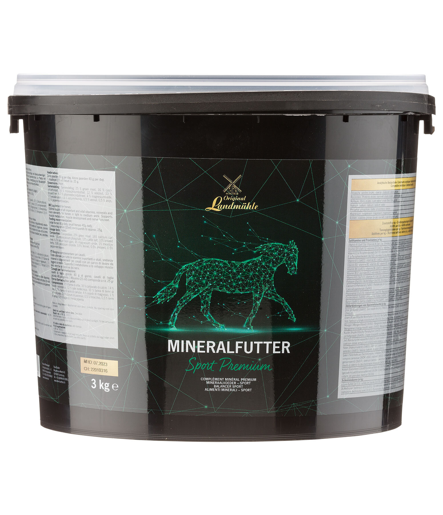 Voor een optimale verzorging met alle belangrijke en noodzakelijke vitaminen, mineralen en sporenelementen voor paarden in training. Door de hogere belasting van de spieren en het zweetverlies tijdens de training, is de vereiste aanvoer van mineralen hoger dan normaal. Het Original Landmühle Mineraalvoer Sport bevat daarom belangrijke ingrediënten zoals vitamine E, selenium, magnesium en biotine. De aanwezige vitamine E kan samen met selenium de spierstofwisseling positief beïnvloeden. Aminozuren zoals lysine en methionine kunnen specifiek de spierontwikkeling ondersteunen. Biotine bevordert de hoefgroei en zorgt tegelijkertijd voor een glanzende en sterke vacht. Het mineraalvoer bevat ook belangrijke elektrolyten, zodat de waterhuishouding van het paard na de training kan worden hersteld. Het is daarom optimaal voor sportpaarden van lichte tot middelzware trainingen. Het Original Landmühle Mineraalvoer Sport Premium is op basis van weidegroenmeel en daarom vrij van granen en melasse. Pellets, eenvoudig acceptatie.