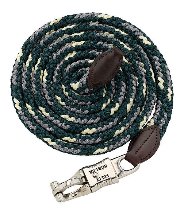 Zeer duurzaam, rondgevlochten halstertouw met elegante lederen uiteinden en paniekhaken. Past perfect bij halster 310040 met zilverkleurig beslag. 2 m. 100 % polypropyleen.