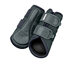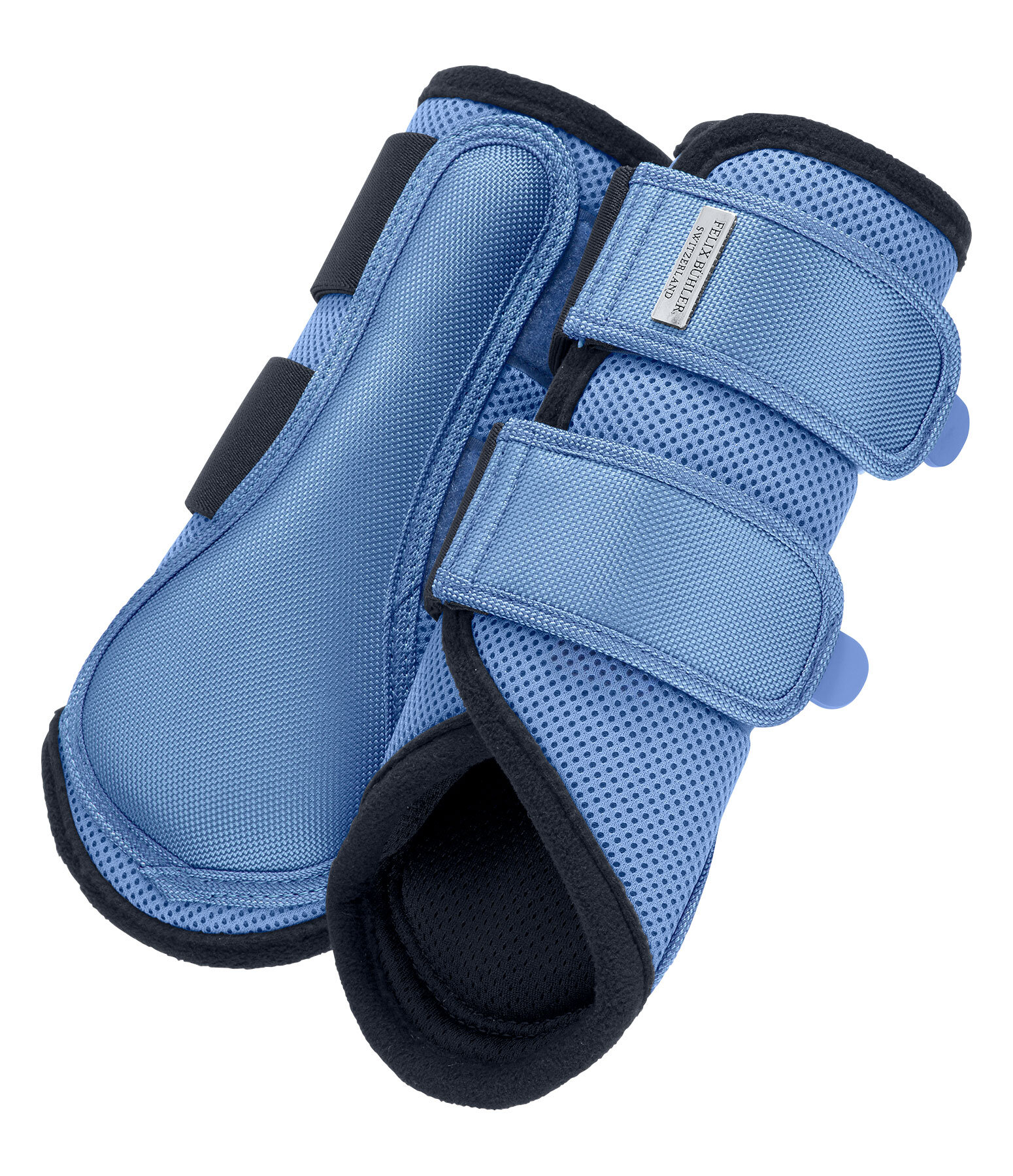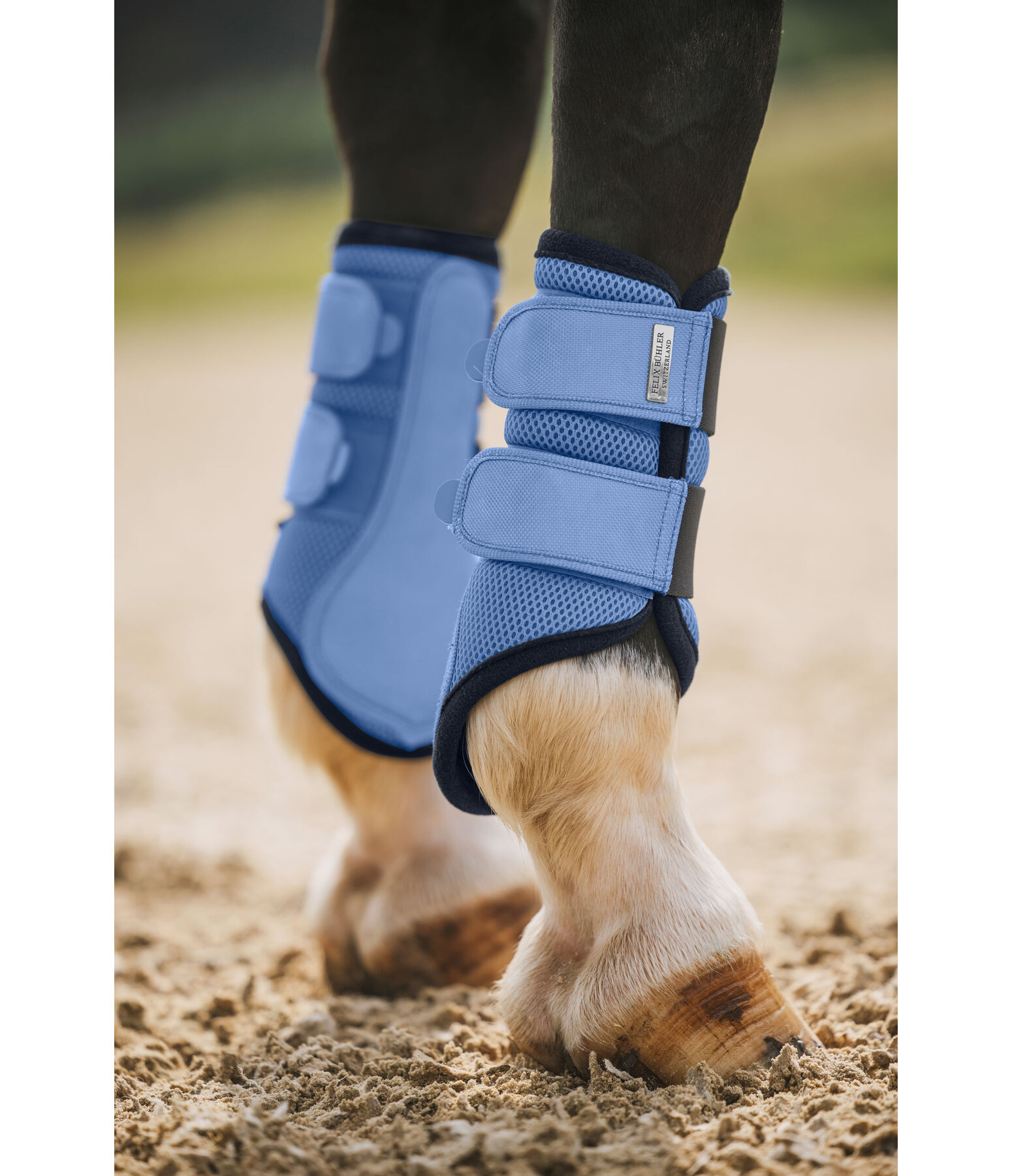 Uiterst ademende, zachte peesbeschermers voor de voorbenen van netstof, die permanente luchtcirculatie mogelijk maken. Met elastische klittenband voor een optimale aanpassing van de maat. Glanzende metalen patches. Versteviging aan de binnenkant voor extra bescherming van de streep. Fleece randen rondom beschermen tegen schuren. 100 % polyester. Per paar.