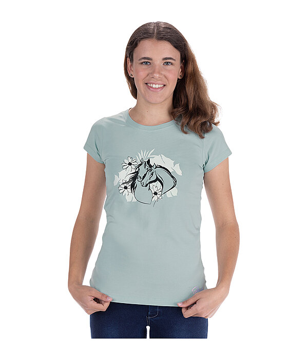 Prachtig T-shirt voor kinderen met een ronde hals en romantische motiefprint. De achtergrond van de print verandert meteen van kleur bij blootstelling aan UV-stralen! Logoprint op de zoom. 95 % katoen, 5 % elastaan.
