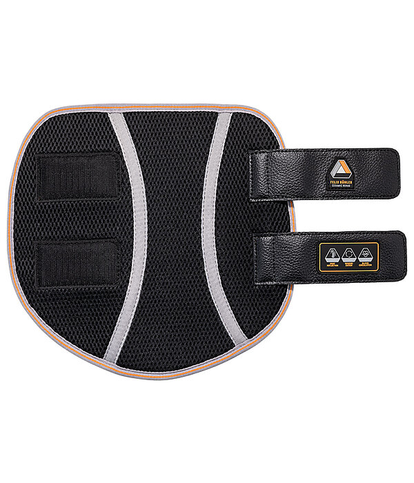 Knusse, anatomisch gevormde en lichte beenbeschermers voor de voorbenen van uiterst ademend Air Mesh weefsel, dat voor een permanente luchtcirculatie zorgt en zo warmteophoping en overmatig zweten voorkomt. Zweet wordt snel geabsorbeerd door de binnenvoering met grote poriën. Na de training kan de beschermers gewoon worden opgehangen om te drogen. De oranje voering is niet alleen ademend, maar kan dankzij de versmolten keramische vezel ook de bloedsomloop helpen stimuleren en zo een ondersteunende werking hebben in de opwarmfase en peesblessures helpen voorkomen. Ook ideaal voor chronisch zieke paarden met bijv. artrose of voor training na de herstelfase (bijv. na een peesbeschadiging). Twee brede en robuuste, afwasbare klittenbandsluitingen zorgen voor een stevige grip. Gebruik tijdens de zwangerschap wordt afgeraden. Gebruiksaanwijzing: Draag het product de eerste dagen maximaal 4 uur per dag om het lichaam langzaam te laten wennen aan het effect. Verhoog daarna geleidelijk de duur. Raadpleeg bij acute blessures voor gebruik een arts. Gebruik tijdens zwangerschap wordt afgeraden. 100% polyester.