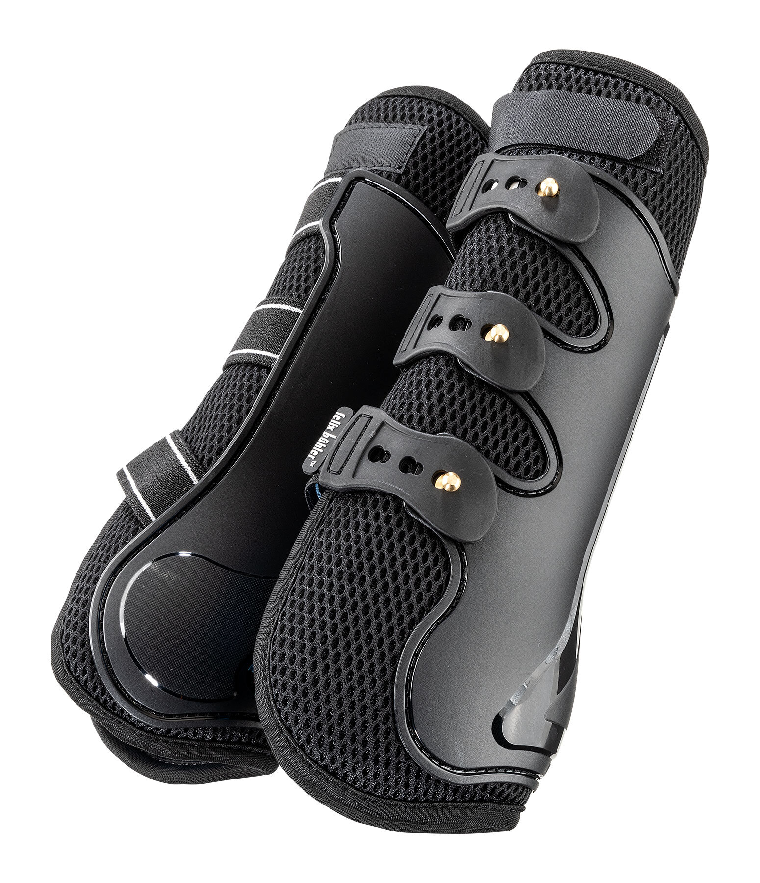 Deze beschermers hebben een anatomisch gevormde, schokabsorberende harde schaal die extra bescherming biedt aan de buig- en strekpezen. Vooral erg handig in het dressuurwerk. Het Air Mesh materiaal aan de binnenkant zorgt voor goede luchtcirculatie. Door de elastische snelsluiting zijn de beenbeschermers heel gemakkelijk aan het paardenbeen te bevestigen. Per paar.