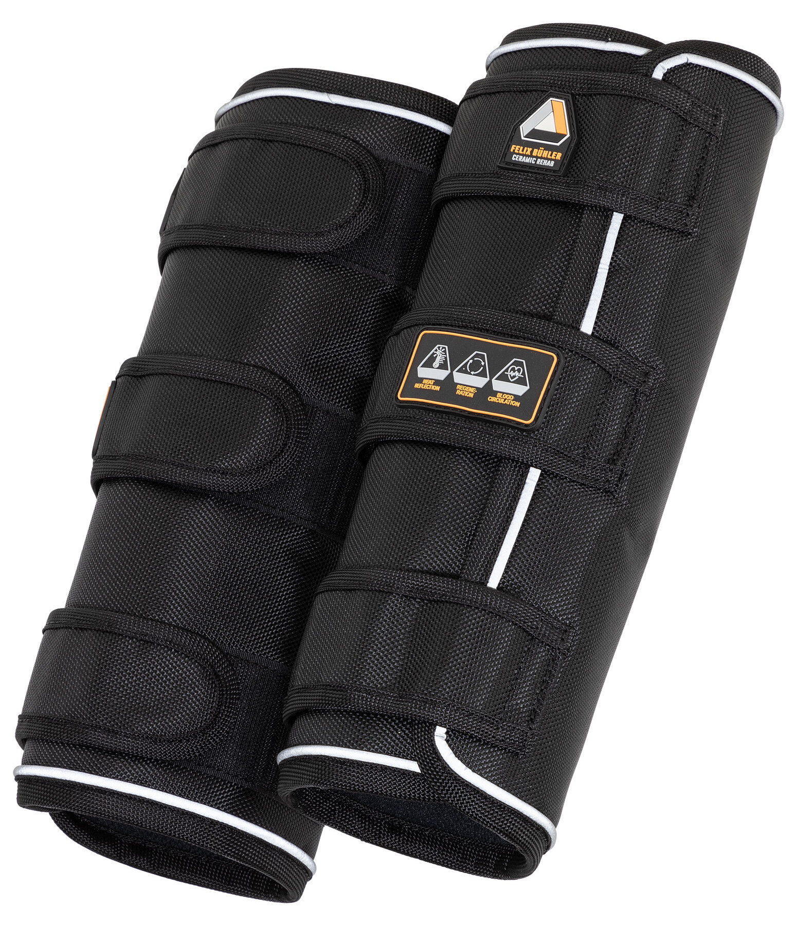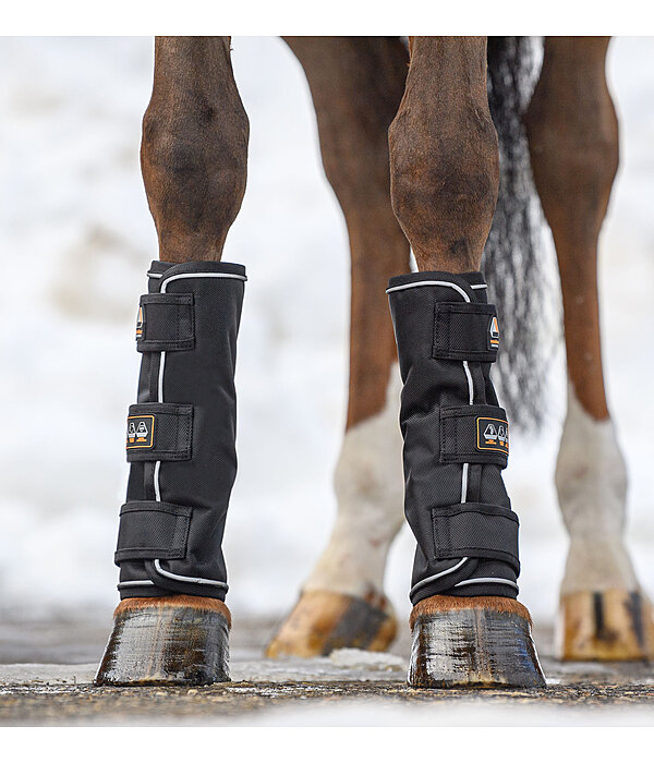 Functionele, bijzonder robuuste outdoor peesbeschermers die dankzij het scheurvaste en waterdichte nylonweefsel (1.680 denier, waterkolom 3.000 mm, ademend vermogen 3.000 g/m2/24h) geschikt zijn voor de dagelijkse paddockwandelingen in weer en wind. De gesmolten keramische vezel in de ademende binnenzijde bevordert de bloedcirculatie en kan daardoor regeneratieprocessen ondersteunen en een gunstig effect hebben op chronische aandoeningen van het bewegingsapparaat. De reflecterende biezen zorgen voor extra veiligheid. 3 stabiele klittenbanden maken snel en gemakkelijk aan- en uittrekken mogelijk. Vormvast dankzij de lichte vulling (50 g). Dankzij hun lichte gewicht en rechte snit sluiten zij goed aan op het been van het paard en beperken zij niet de bewegingsvrijheid. Geschikt voor de wasmachine op 30 °C. Buitenmateriaal 100% nylon, voering van ademend Air Mesh-weefsel met versmolten keramische vezels. Let op: niet gebruiken in enkel-diepe modder of in enkel-diepe plassen. Vocht kan van onderen in de peesbeschermers doodringen; de voering is NIET waterdicht. Per paar.