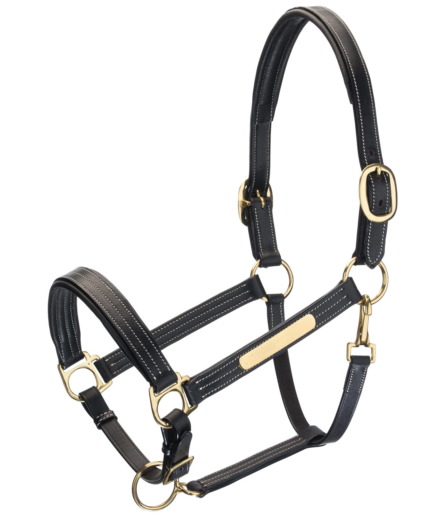 Elegant lederen halster met witte stiksels en graveerplaatje op het linker bakstuk. Het graveerplaatje kan eenvoudig worden losgeschroefd en naar wens worden gegraveerd bij uw plaatselijke schoen- of sleutelmaker. Nekstuk en neusriem van zacht gepolstert leder voor meer draagcomfort. Optimaal verstelbaar aan de kinriem en dubbel verstelbaar aan het nekstuk. Met goudkleurig gespwerk.