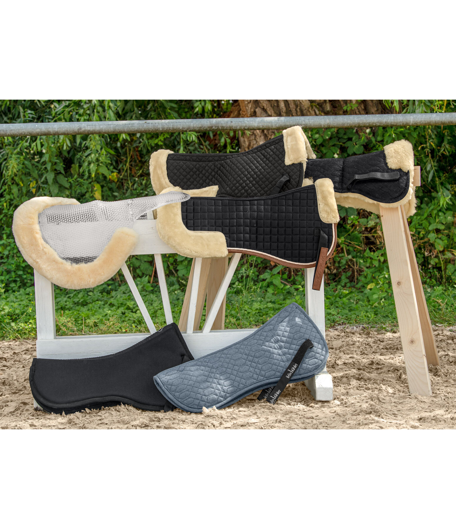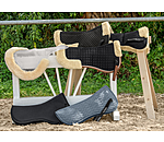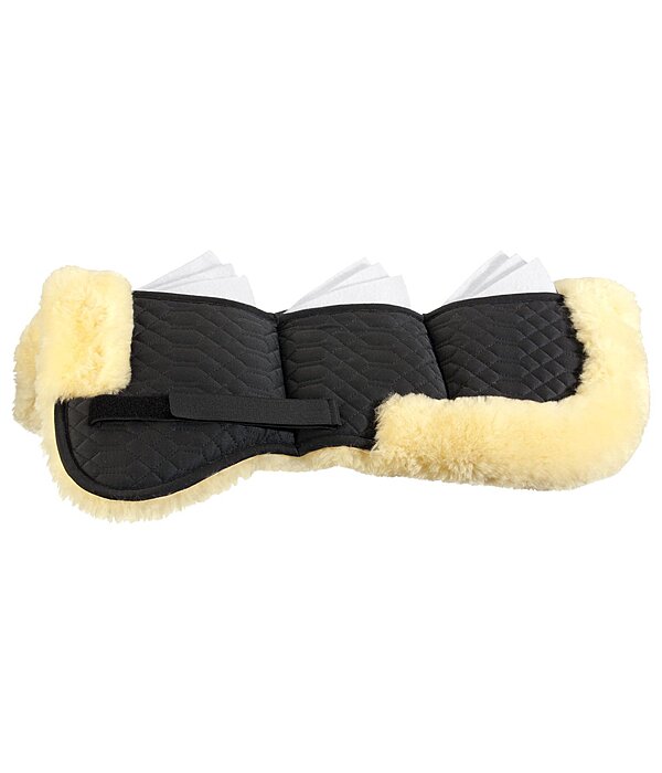Zadelonderlegger voor het uitbalanceren van de zadelpositie met variabele inzetstukken. 6 zakken met rits, elk gevuld met 3 vilten inzetstukken per zak, die afzonderlijk kunnen worden gebruikt. Volledige bekleding van medisch lamswol en bontranden aan de voor- en achterkant. Het lamswol is korter geschoren langs de ruggengraat voor optimale ruggengraatvrijheid. Zadellussen met klittenbandsluiting. Ruglengte 65 cm.