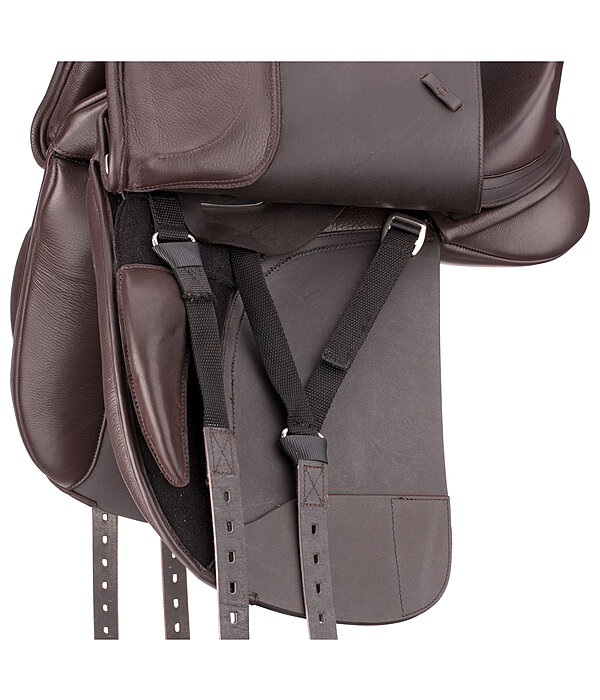 Elegant dressuurzadel van echt leder met een anatomische diepe zit. Voorzien van een stabiele maar flexibele zadelboom van kunststof, een vervangbaar kopijzer en een Y singelsysteem. De brede zadelkussens zijn gevuld met synthetisch wol en bieden een optimale drukverdeling. De klittenbandwrongen kunnen individueel aangepast worden. Wordt geleverd met een lichtblauw (normaal, 30 cm) kopijzer.