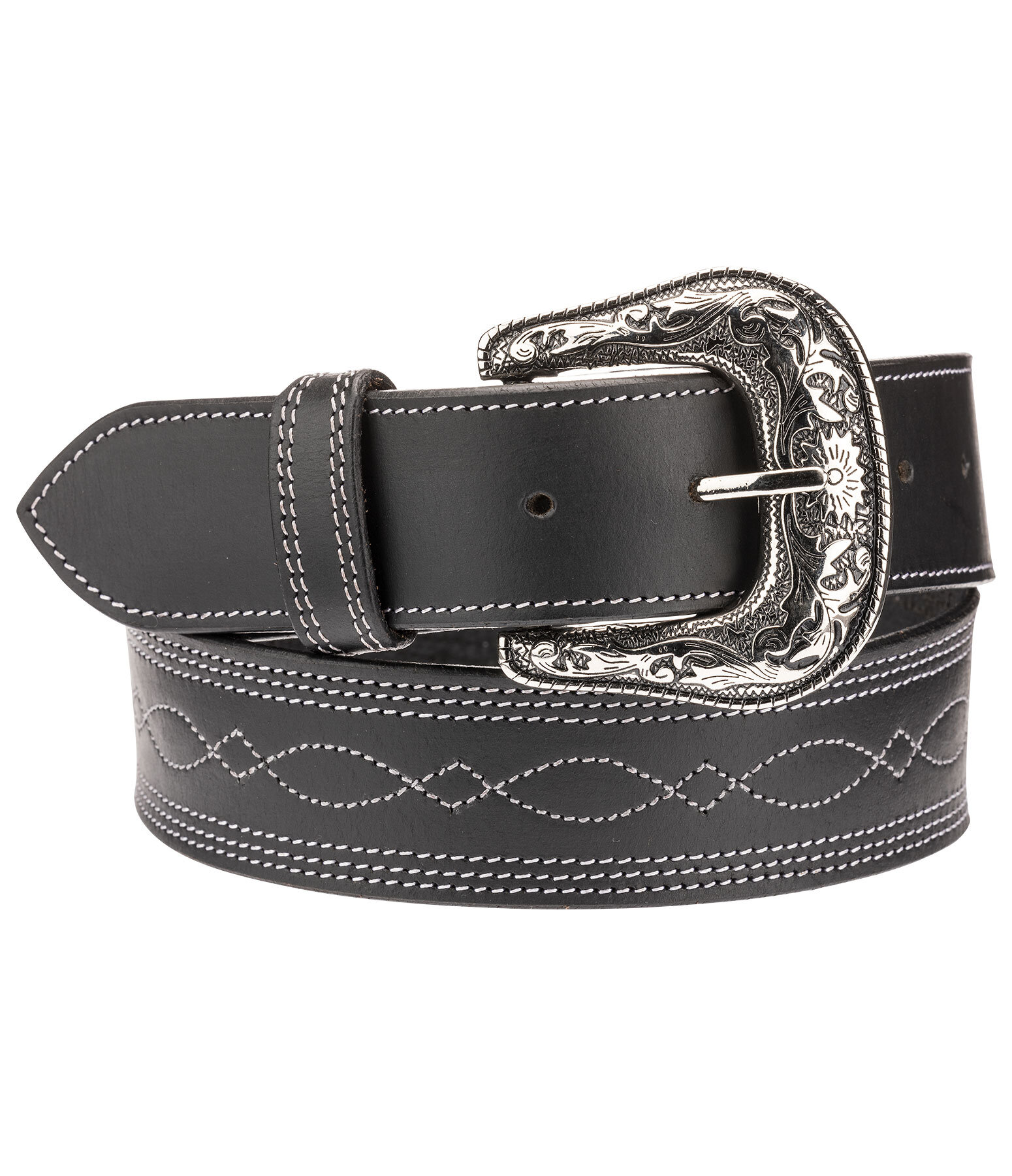 Stijlvolle lederen riem met decoratieve stiksels. Antieke, verwisselbare riemgesp. Breedte 3,8 cm.