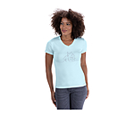 Ademend, sneldrogend functioneel T-shirt met V-hals en mooie glitterpaardenprint op de borst. 88 % polyester, 12 % elastaan.