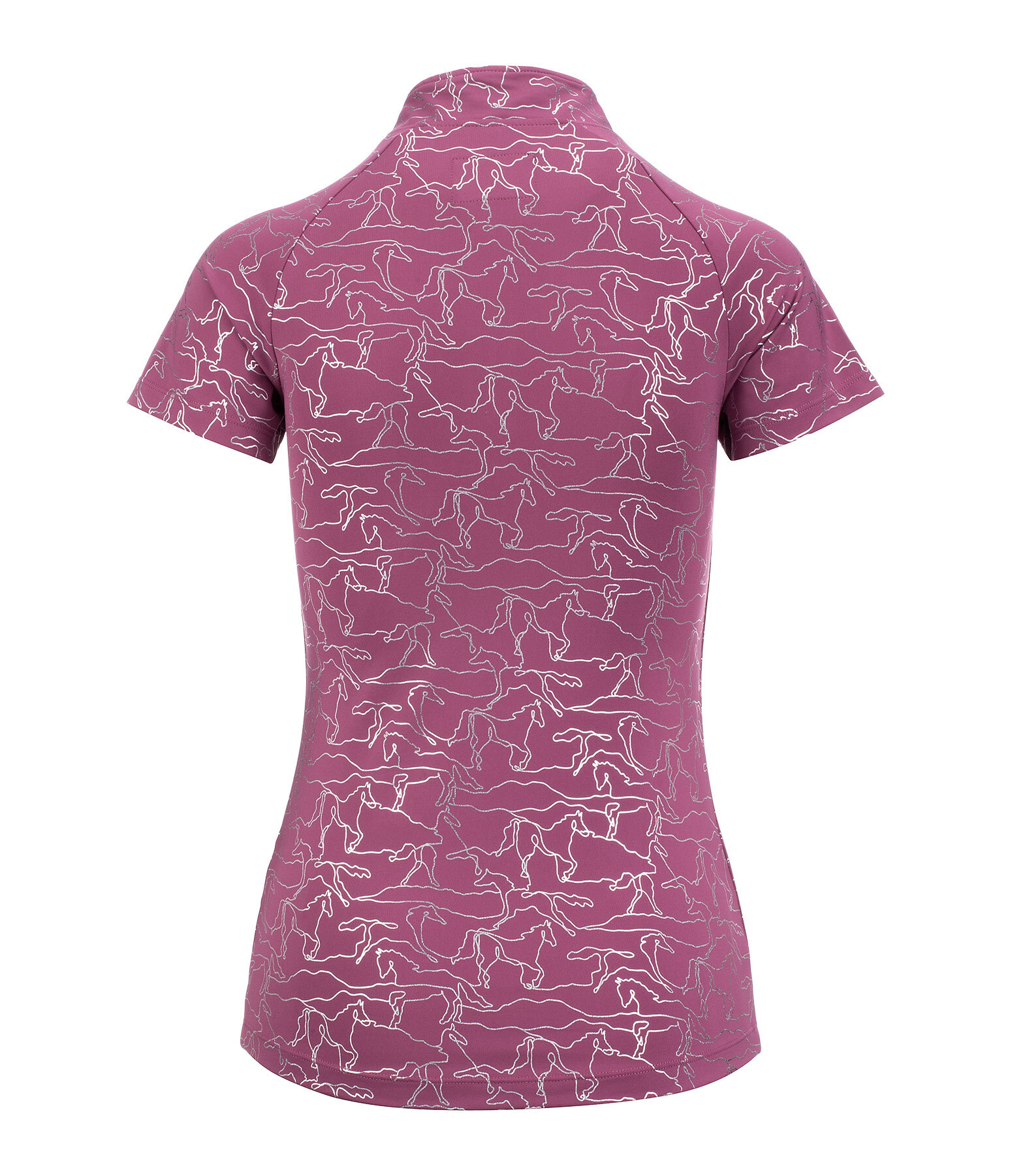 Chique functioneel t-shirt met prachtige, metallic all-over paardenprint. Met raglanmouwen en opstaande kraag met rits en kinbeschermer. Ademend en sneldrogend. 88% polyester, 12% elastaan.