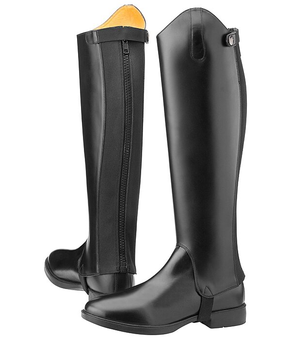 Klassieke glad lederen chaps met voering van zacht varkensleder. Optimale pasvorm dankzij de elastische inzet achteraan en de YKK rits. Met drukknopen en robuuste zoolriemen.