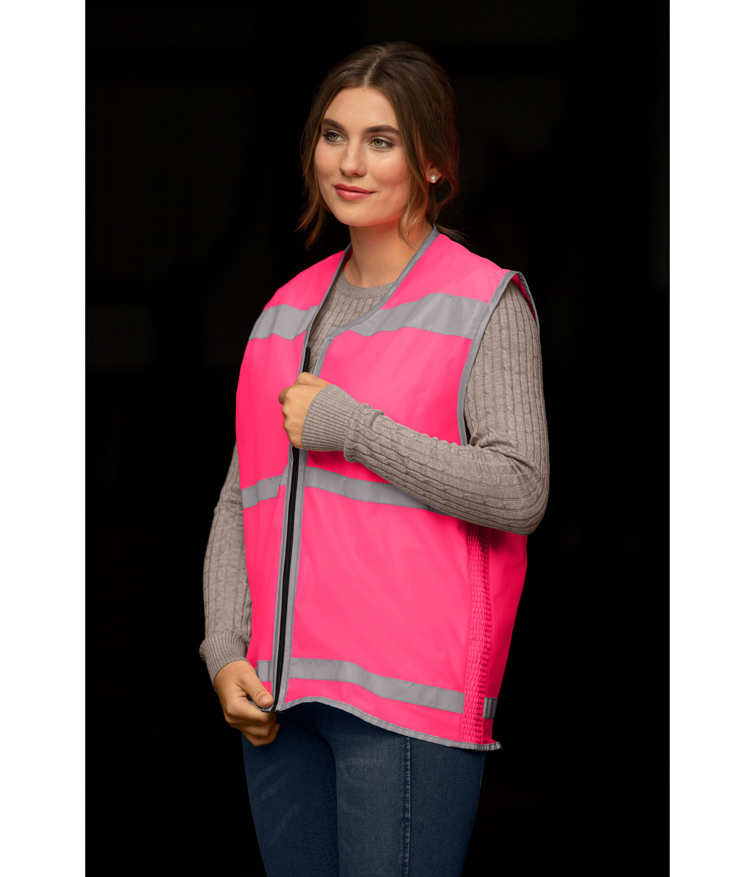 Beschermend vest met hoge zichtbaarheid, veel reflecterende details en ritssluiting aan de voorkant voor een stevige grip in alle gangen. Met groot reflecterend waarschuwingssymbool op de rug met het opschrift "HORSE IN TRAINING". Het gilet heeft een extra wijde snit en is verkrijgbaar in verschillende maten, zodat het gemakkelijk kan worden gecombineerd met een dikke jas. Elastische inzetstukken aan beide zijden zorgen voor een optimale pasvorm. Gecertificeerd volgens EN 471. 100 % polyester.