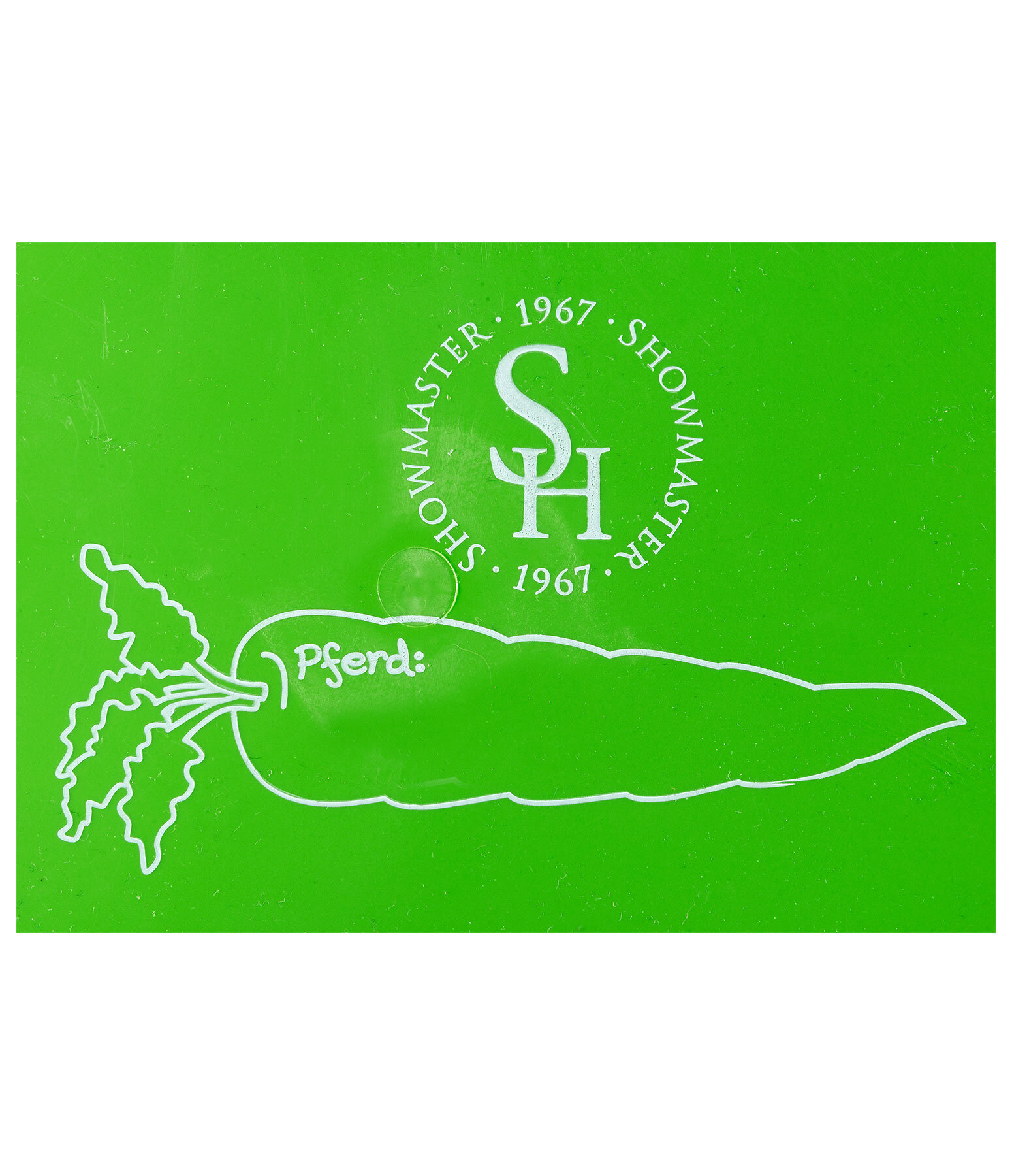 Deksel voor wortelemmer Pippa gemaakt van voedselveilige materialen. Met Showmaster branding en speels wortelmotief om de naam van je paard aan toe te voegen.