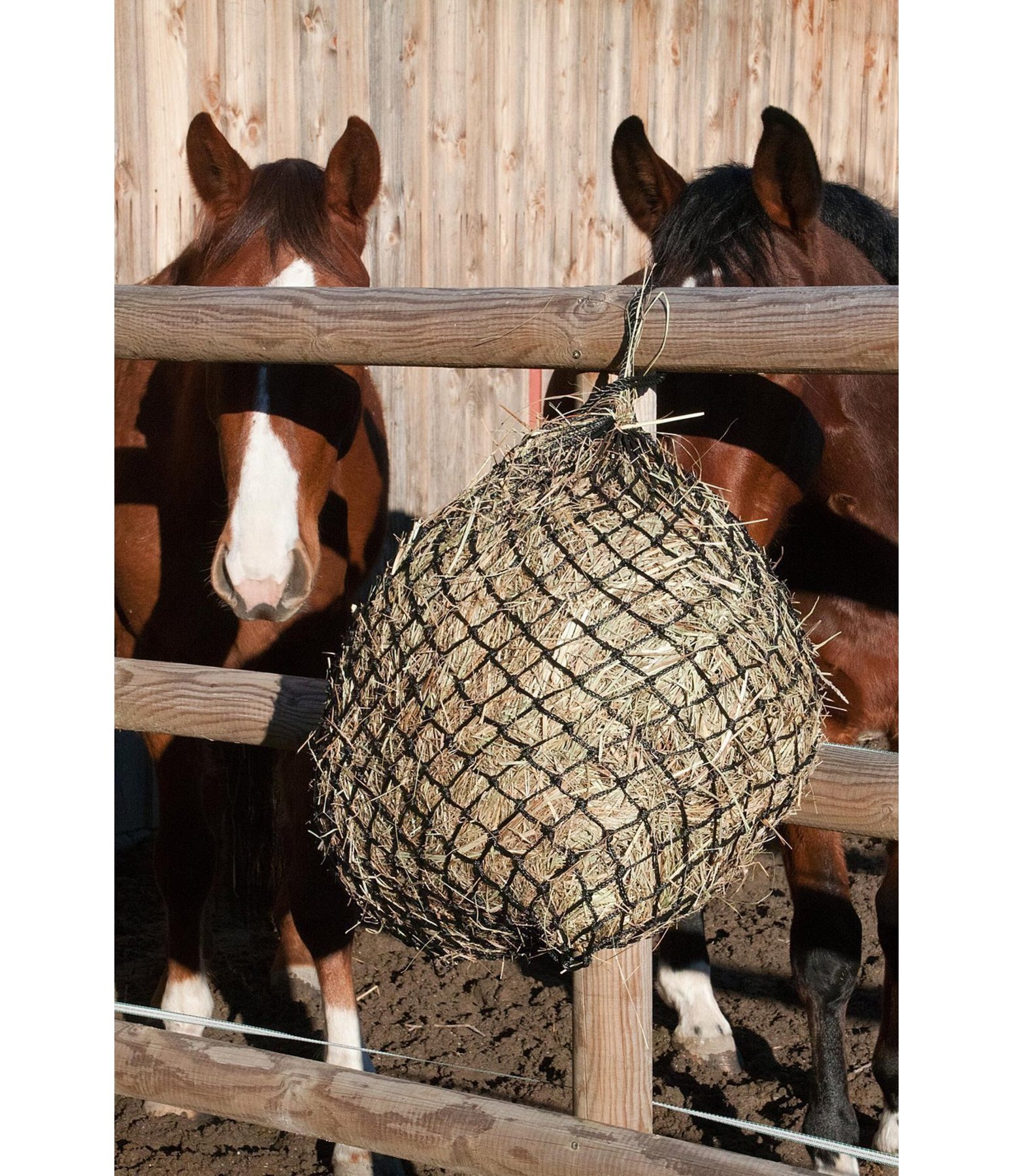 Hooinet van polypropyleen. Maaswijdte ca. 3 x 3 cm. Afmetingen ongevuld 90 x 90 cm. Capaciteit 4 kg. Hittebestendig tot 100°C.