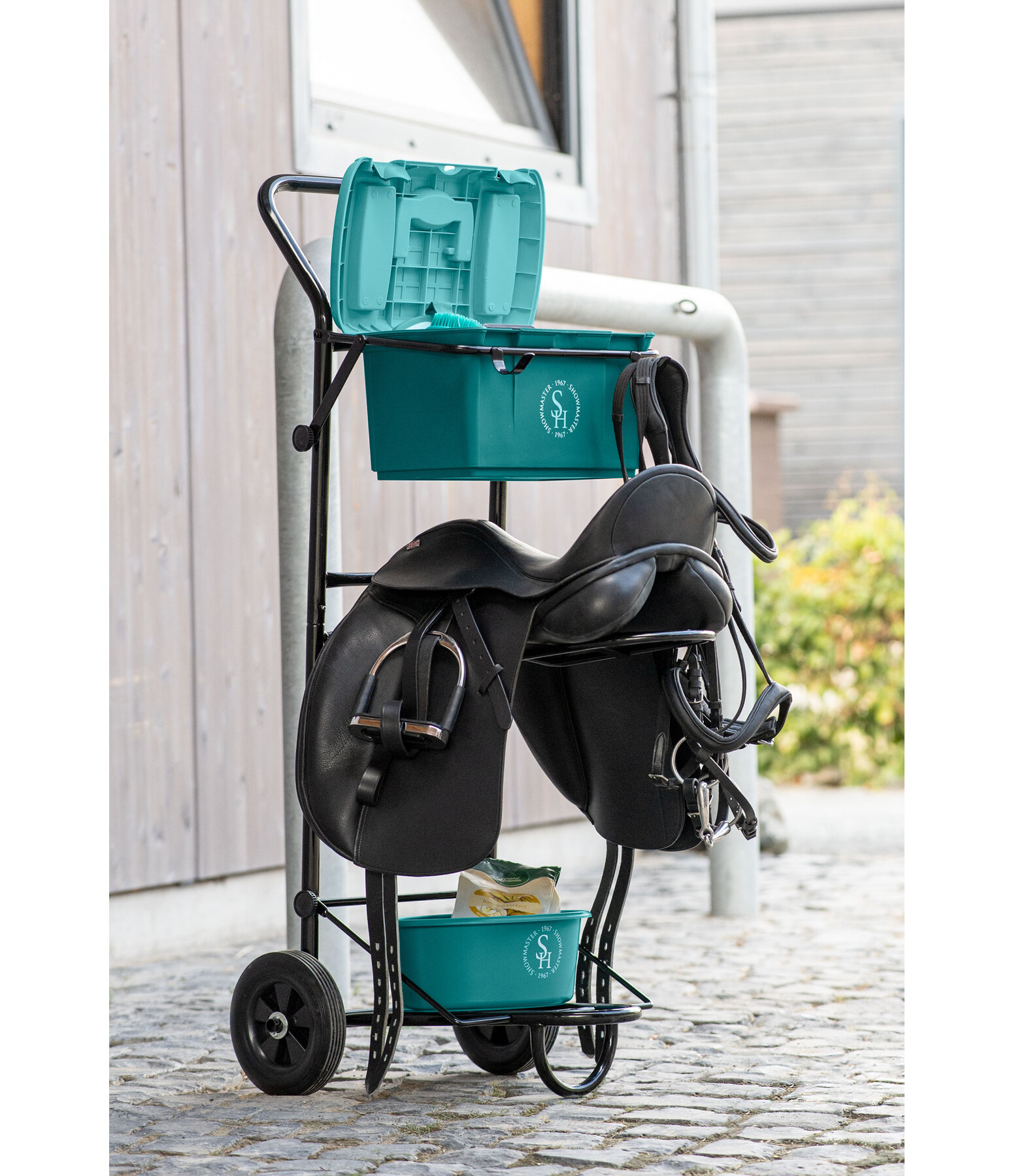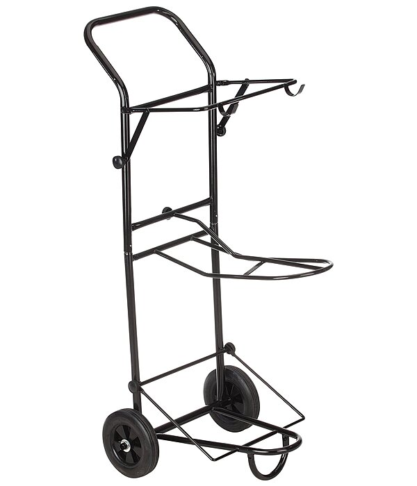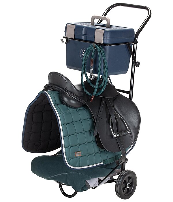 Stabiele zadelbutler op wielen bestaande uit stalen buizen met plaats voor zadel, hoofdstellen en poetsgerief. Poetsbox "Lissabon"(art. 4310 889) past bovenin. Ideaal voor op stal, wedstrijd of voor onderweg. Afmetingen: 130 x 58 x 38 cm, plaats voor poetsbox 30 x 40 cm. Inklapbaar.