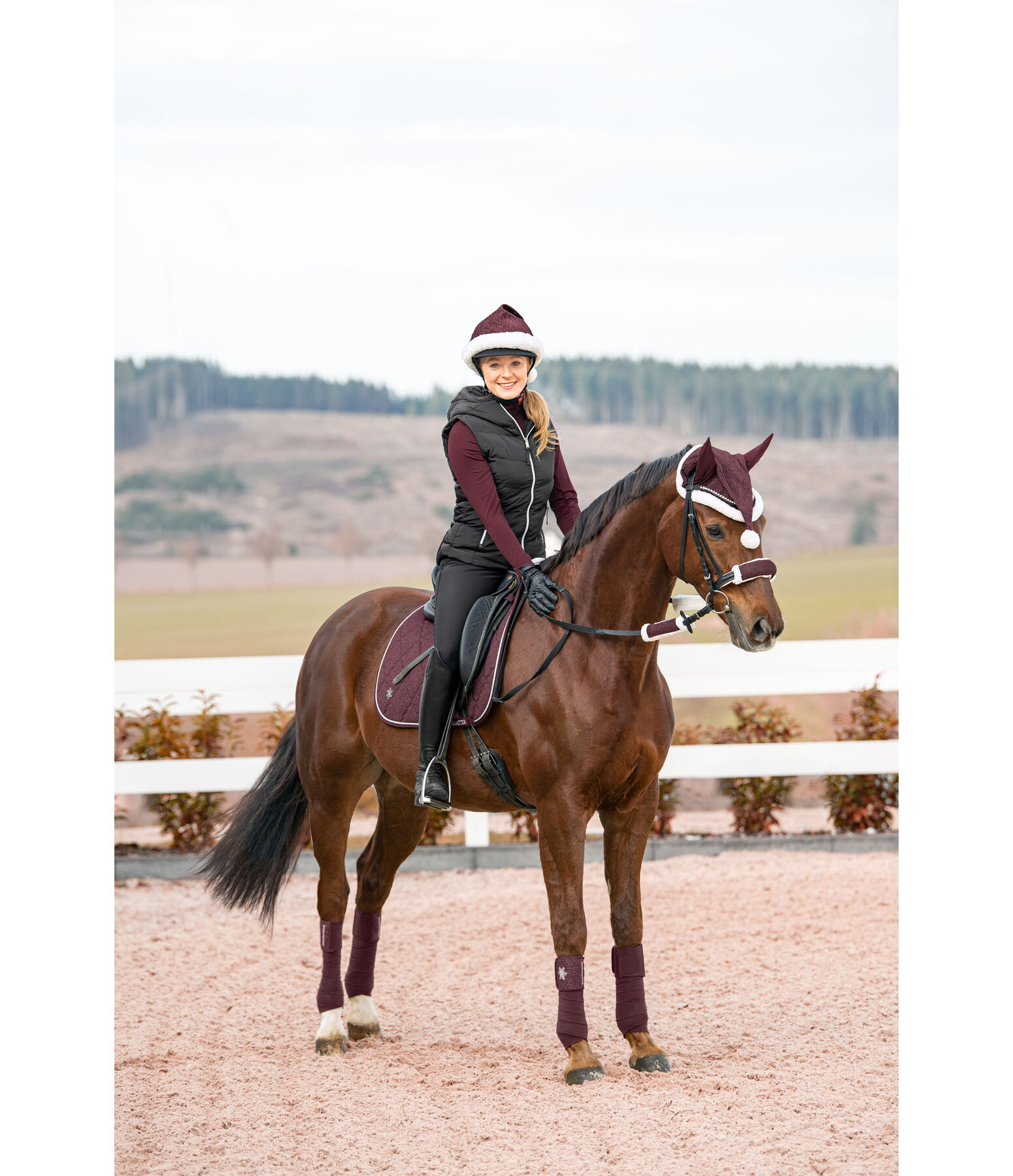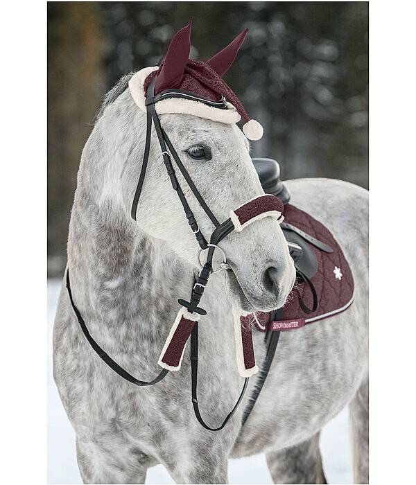Kerstelijke paardenmuts met glitters, teddyfleece rand en pompom. 100% polyester.
