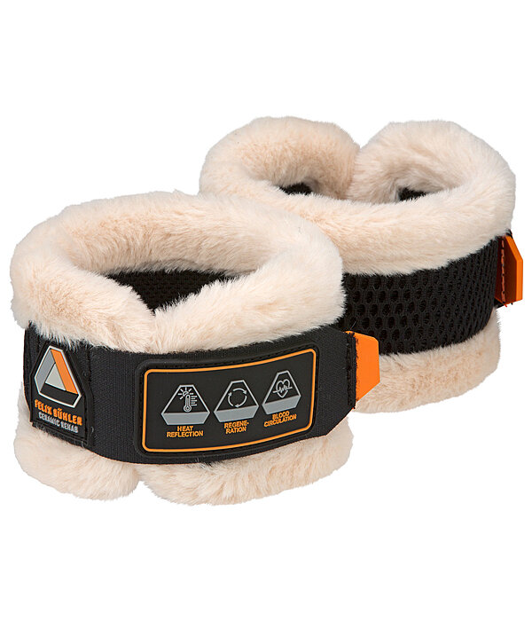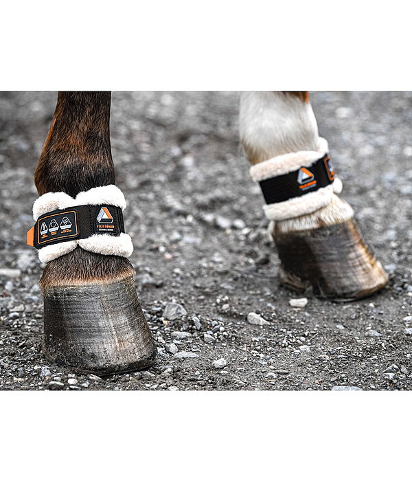 Flexibele bescherming voor het kogelgewricht van ademend spacer-materiaal. Voering met ingesmolten keramische vezels, die de bloedsomloop stimuleert en de lichaamswarmte weerkaatst. Zo kunnen peesletsels worden voorkomen. Beschermt bij contact met een obstakel, precies op het punt waar normale beschermers niet bij kunnen. Kan ook worden gebruikt voor therapeutische doeleinden in geval van ziekten van het hoefrol-/ hoefgewricht. Zachte banden van teddyfleece om schaafwonden te voorkomen. Individuele maataanpassing dankzij eenvoudige klittenband. 100 % polyester. Per paar.Gebruiksaanwijzing: Draag het product de eerste dagen maximaal 4 uur per dag om het lichaam langzaam te laten wennen aan het effect. Verhoog daarna geleidelijk de duur. Raadpleeg bij acute blessures voor gebruik een arts. Gebruik tijdens zwangerschap wordt afgeraden.