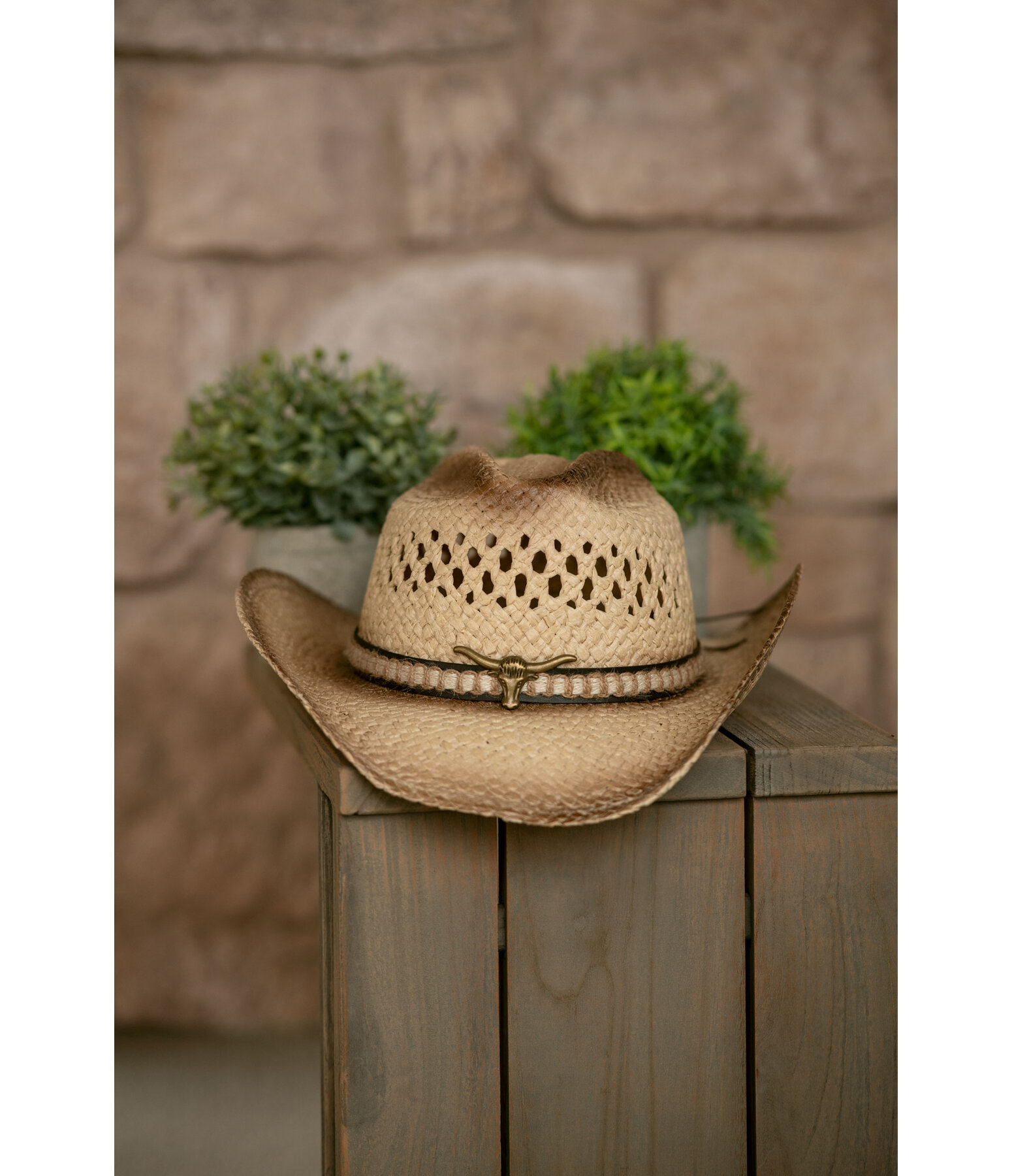 Strohoed met rustieke hoedenband. Elastische binnenband voor een betere pasvorm.
